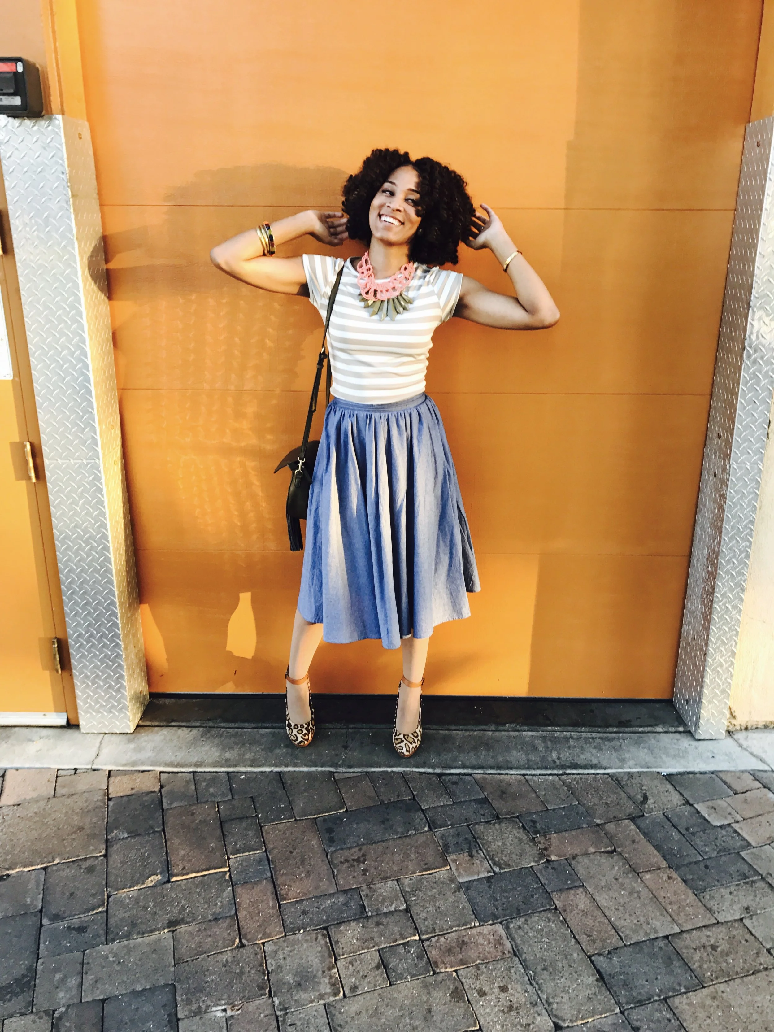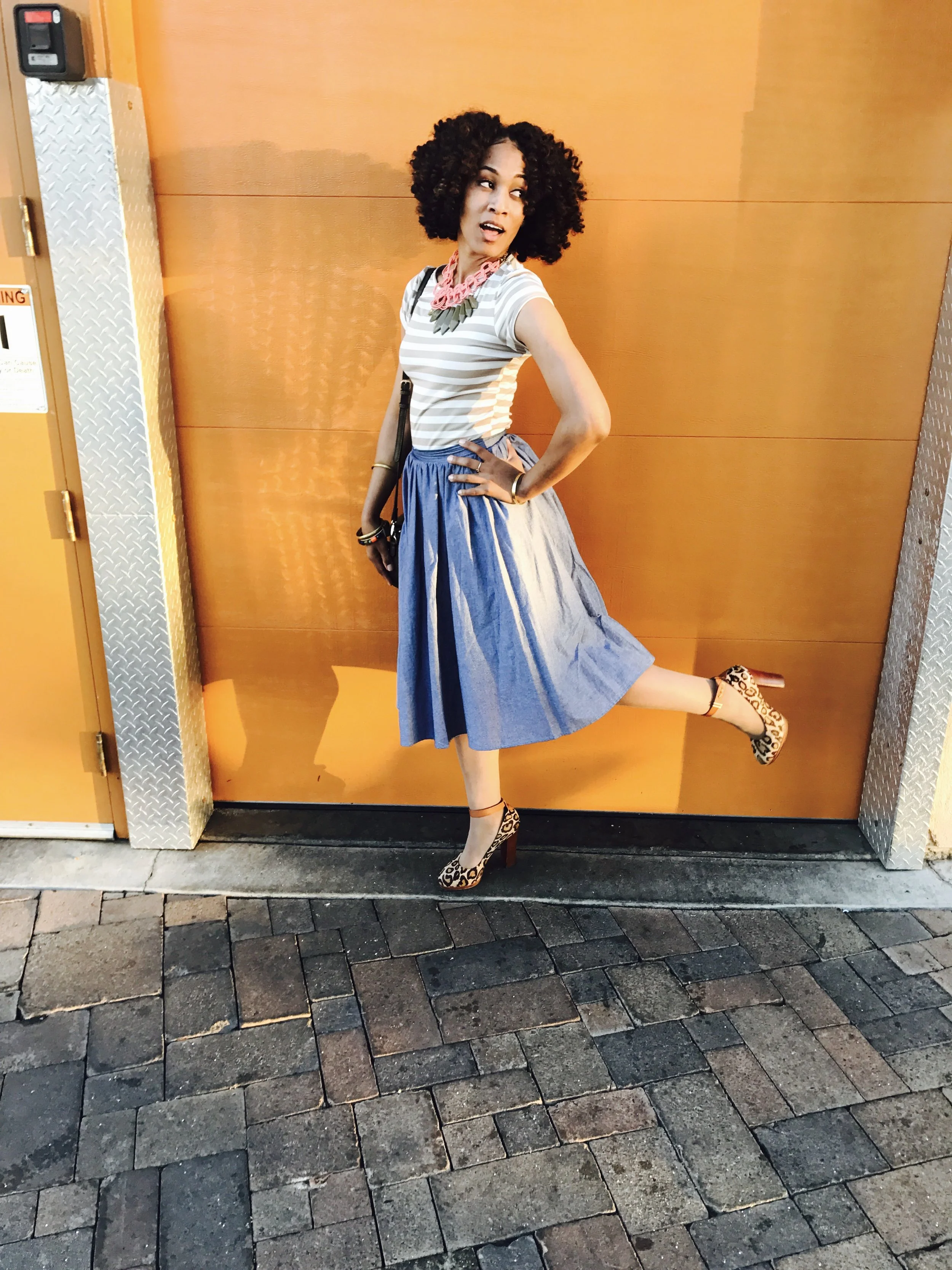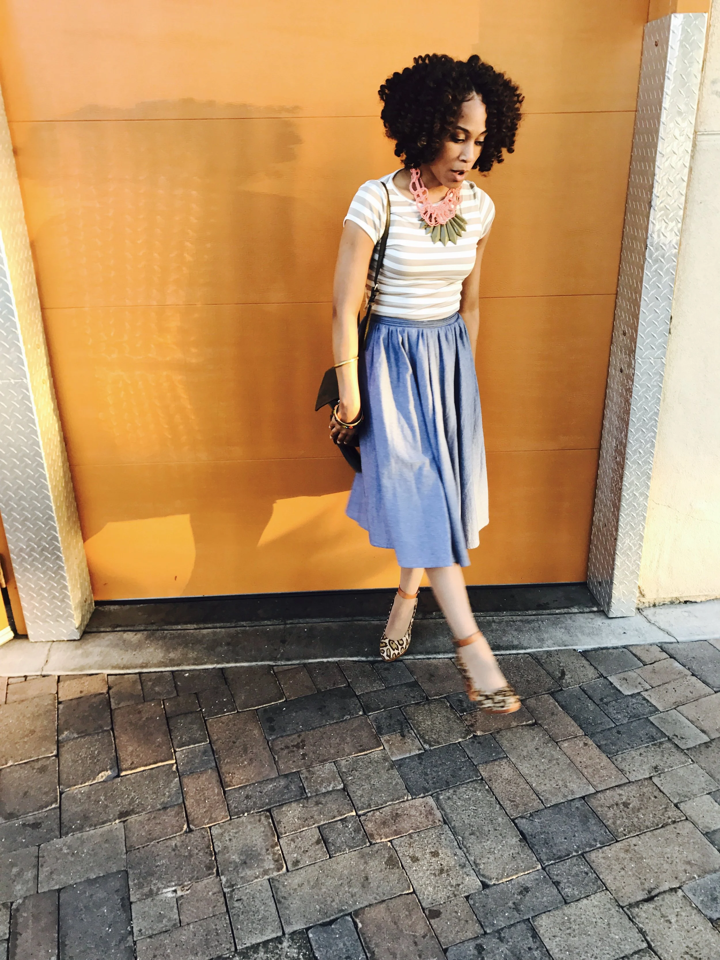 Below I've paired a striped blouse with leopard shoes. These pieces have two different patterns but they are in the same color family. The dark areas in the leopard print shoes serve as a contrast to the tan. I chose to break it up with a blue Chambray skirt. To create a little more depth, I wore an olive green necklace with a peach necklace layered over the top of it-(one of my little jewelry tricks!)
