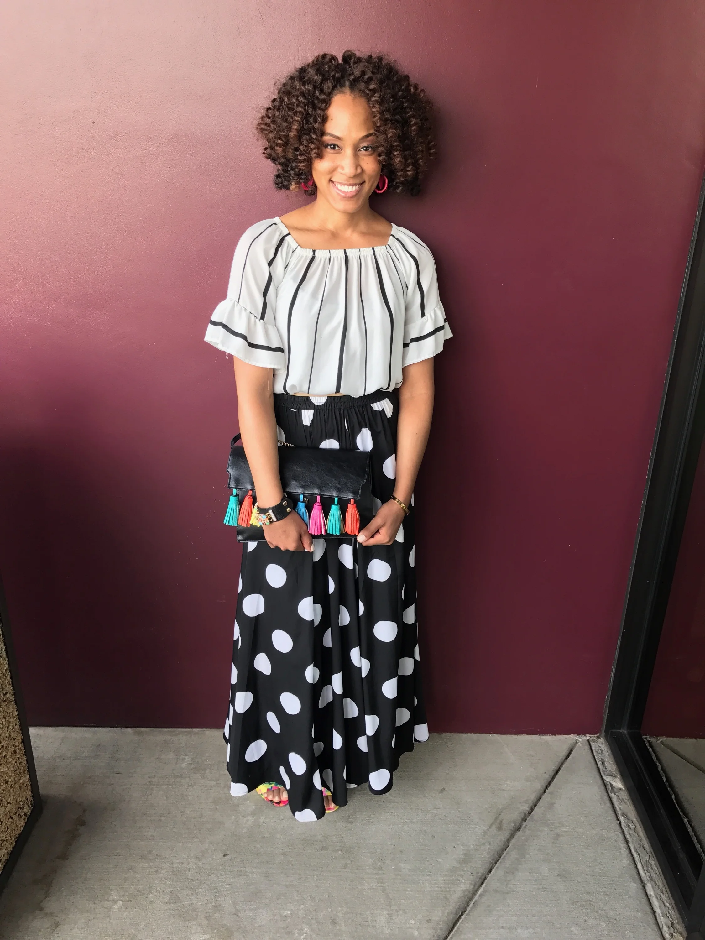 The second look is one of my favorites! -Polka dots and stripes! Because the polka dots were large, I went for a thin line on the blouse.